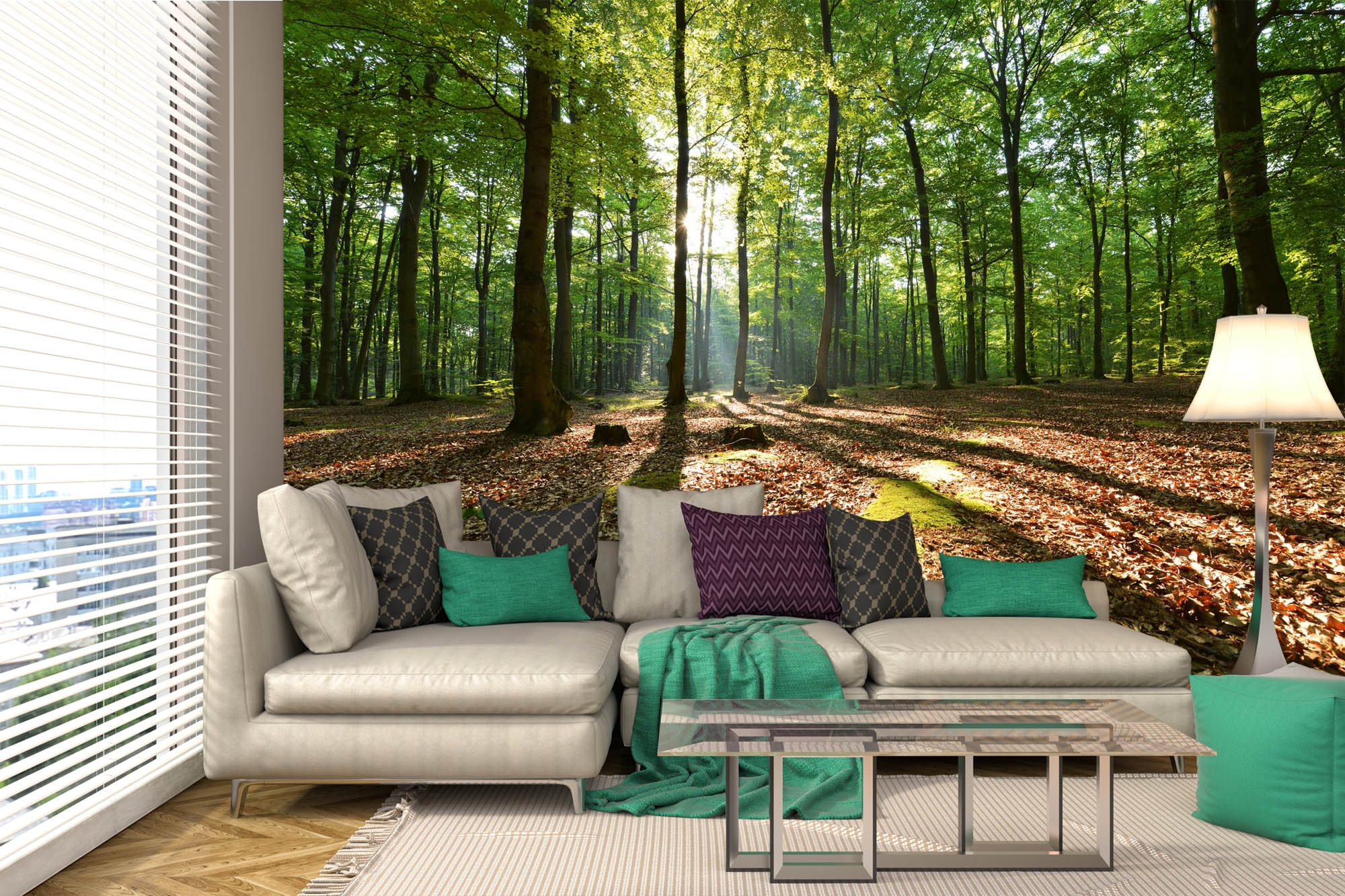 Fototapete MS-5-1852 mit Waldmotiv in einem modern eingerichteten Wohnraum