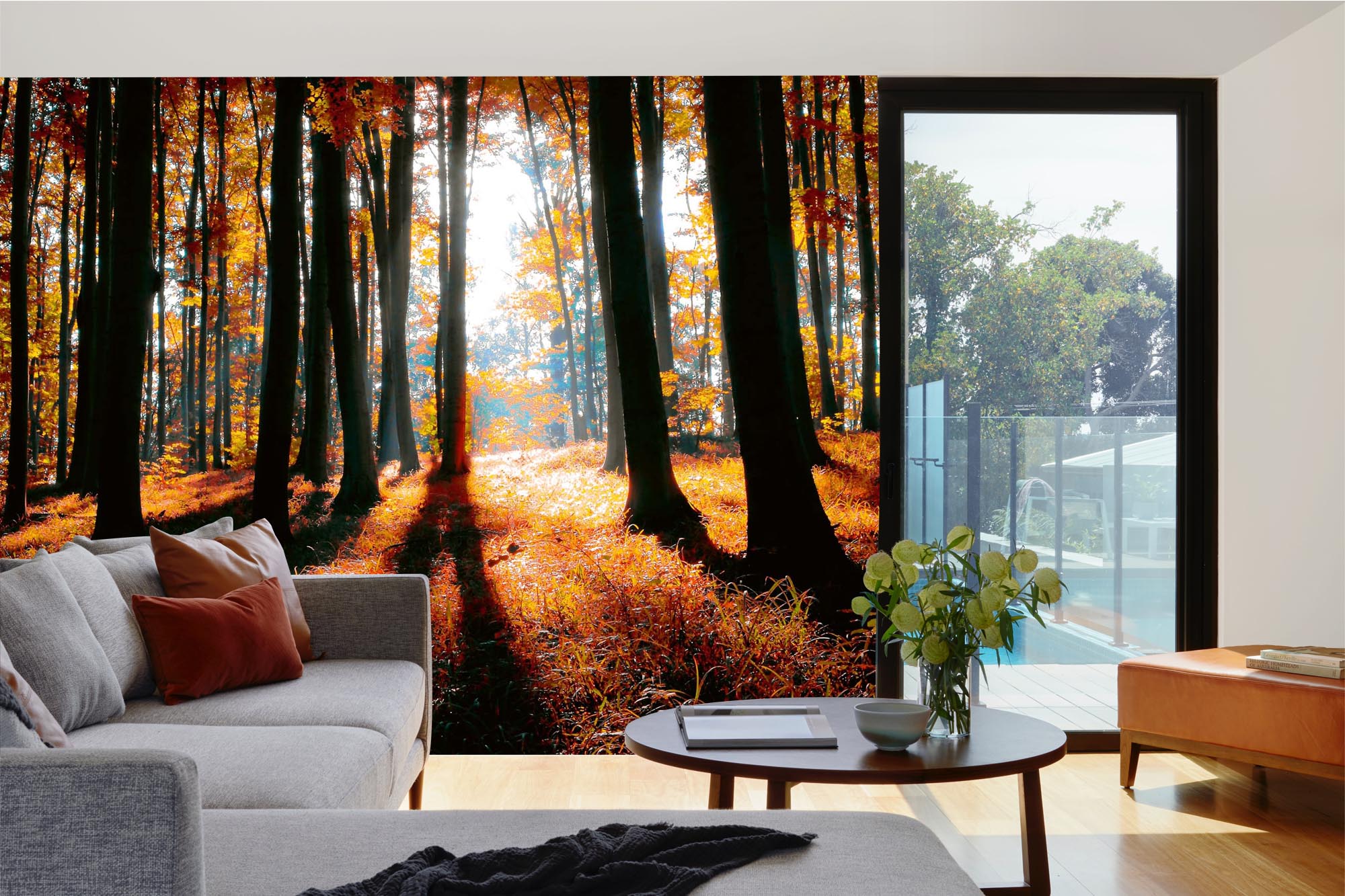 Preview: Fototapete MS-5-1877 mit Waldmotiv in einem modern eingerichteten Wohnraum