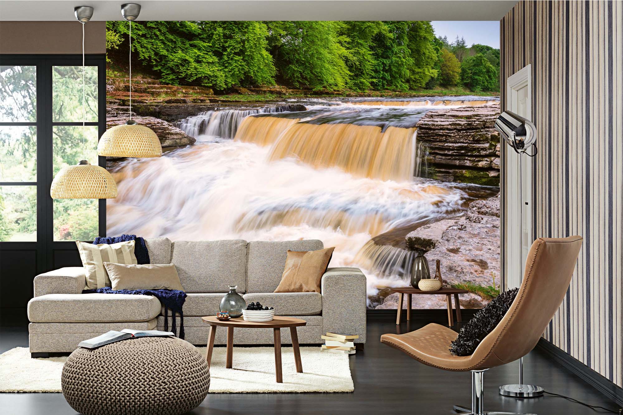 Fototapete MS-5-3159 mit Wasserfall-Motiv in einem modern eingerichteten Wohnraum