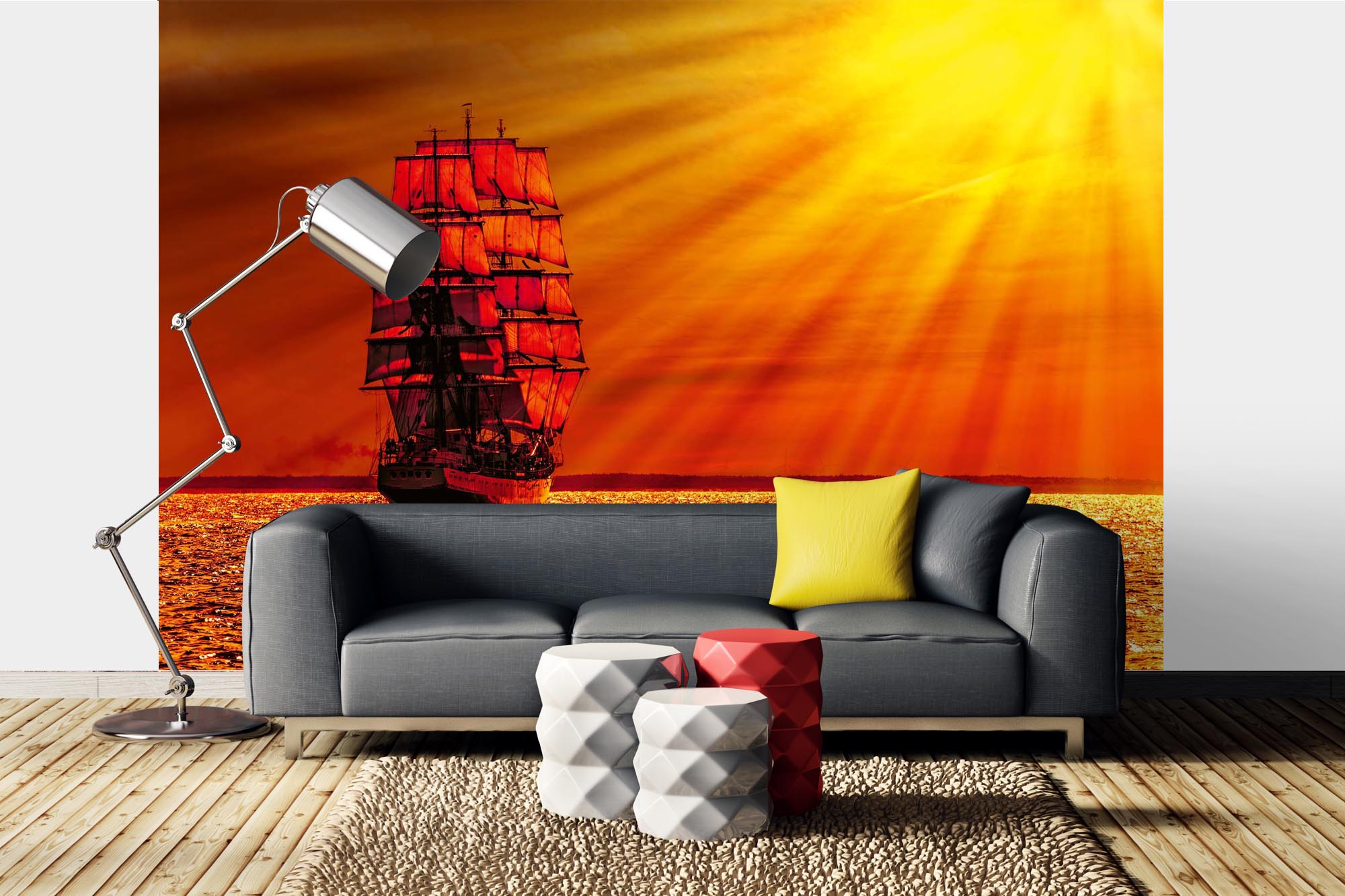 Preview: Fototapete MS-5-2770 „Boote & Schiffe“ als Wanddekoration in modernem Wohnraum; stimmungsvolles Hafenmotiv mit räumlicher Tiefe