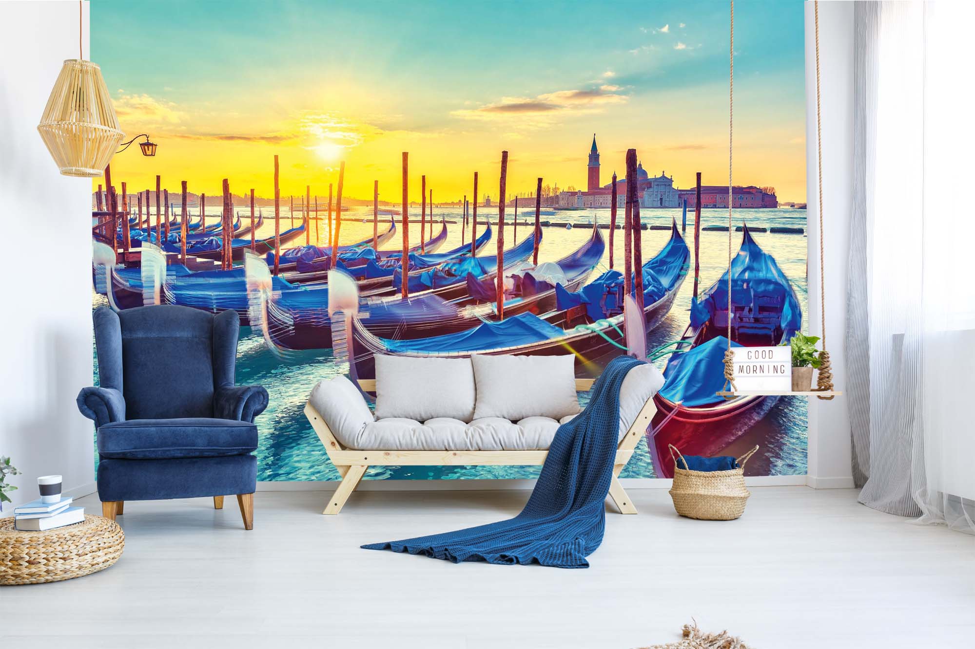 Preview: Fototapete MS-5-2777 „Boote & Schiffe“ als Wanddekoration in modernem Wohnraum; stimmungsvolles Hafenmotiv mit räumlicher Tiefe
