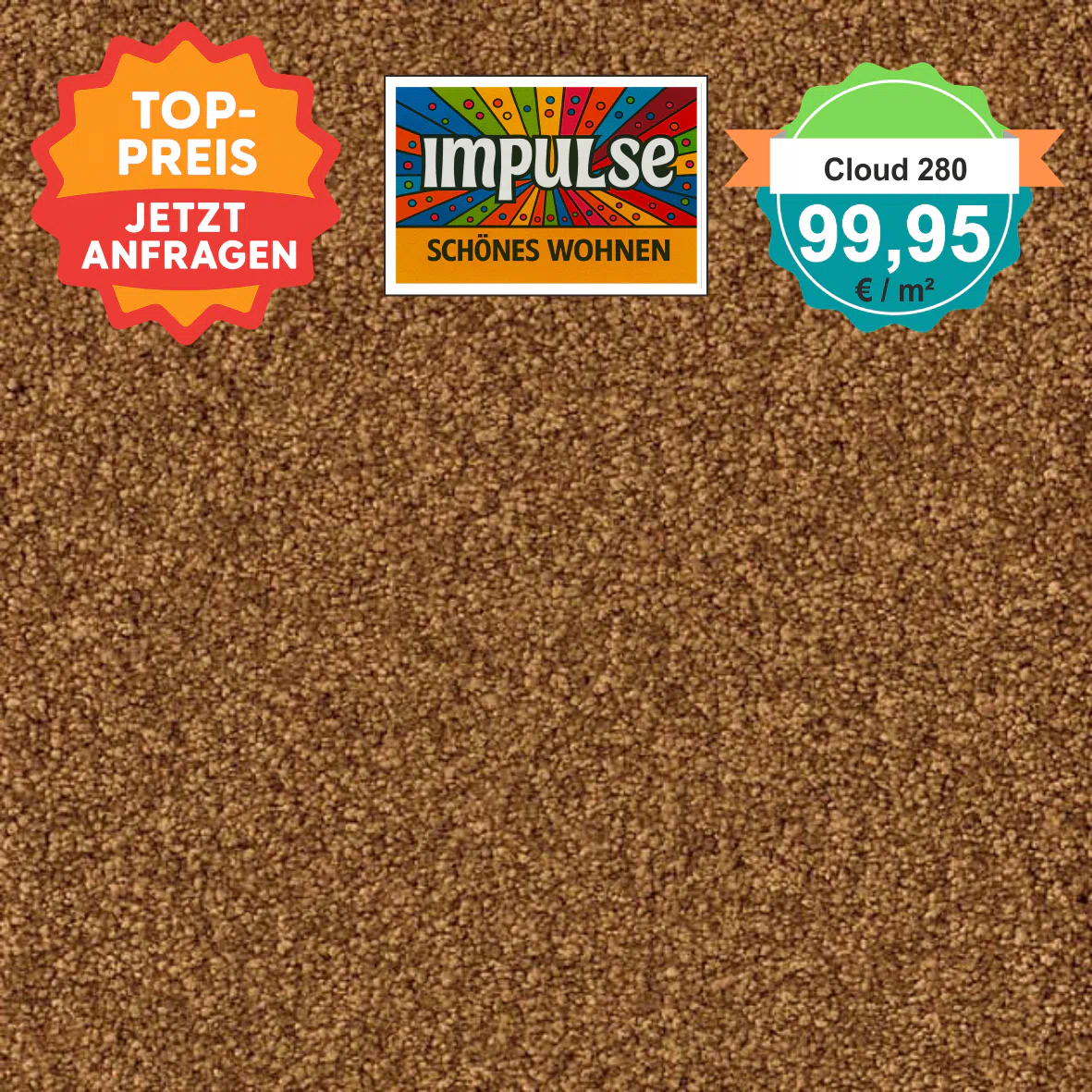 Jetzt zum Aktionspreis von nur 99,95 €/m² statt 108,-- €/m². Dieser hochwertige Markenboden aus 100 % Polyamid überzeugt durch seine starke Strapazierfähigkeit und Pflegeleichtigkeit. Diese Farbe setzt stilvolle Akzente in Wohn- und Arbeitsräumen. Die samtige Velours-Oberfläche sorgt für ein angenehmes Laufgefühl und eine edle Optik.