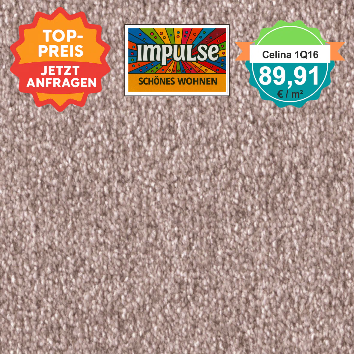 Draufsicht auf Vorwerk Celina 1Q16 fraise Teppichboden mit Preisschild 89,91 €/m²